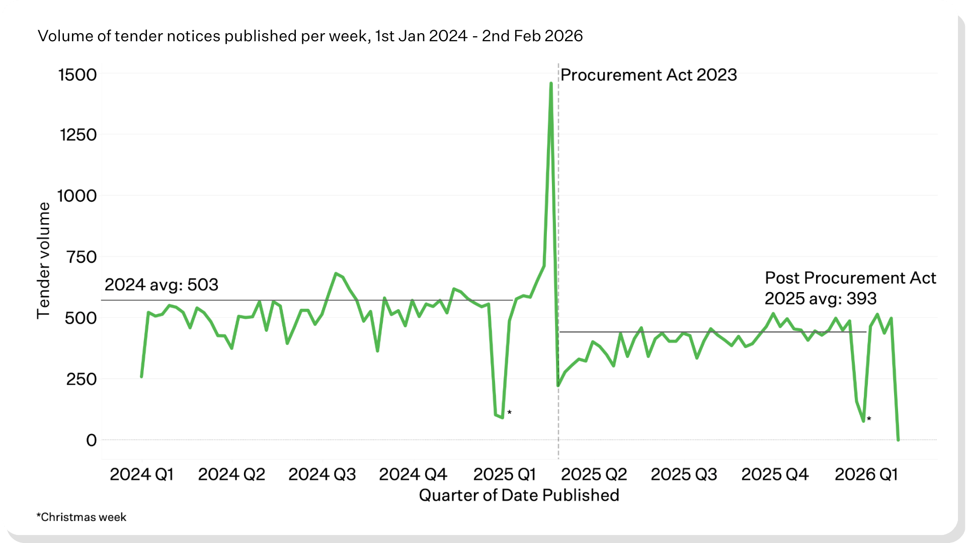 Average weekly new tender notices fell from 503 in 2024 to 393 in 2025 under the new regime.